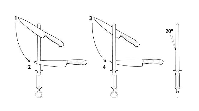 *За да заточите ножа, изтеглете режещия ръб няколко пъти последователно отляво и отдясно по цялата дължина на масата, като осигурите еднакъв брой удари от двете страни.