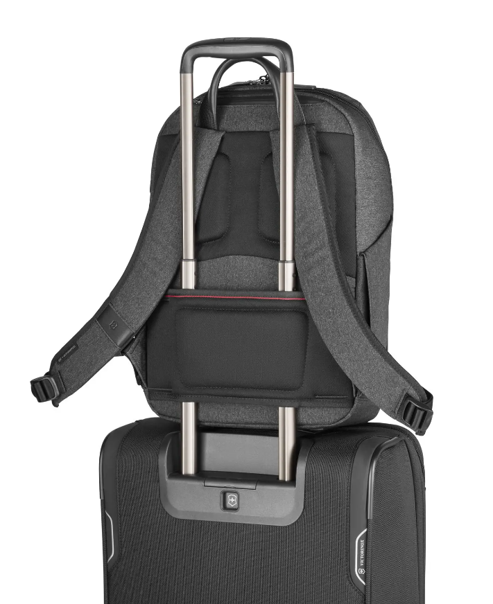- Джоб на гърба за закачане на раницата върху дръжката на куфар при пътуване с много багаж