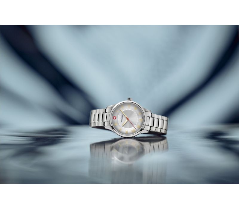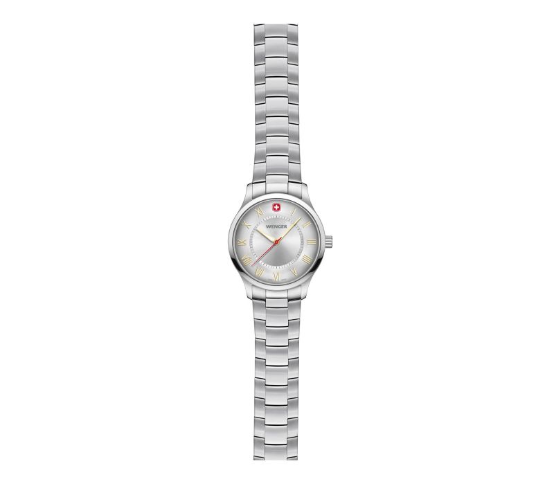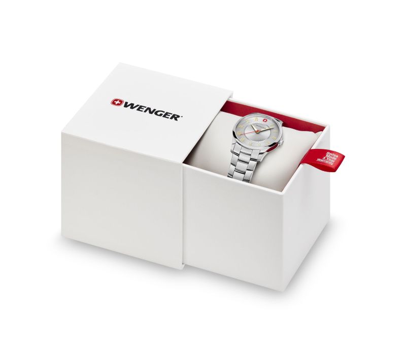 Класически дамски часовник с изчистени форми и римски цифри с верижката. Бял циферблат. Часовниците от тази серия на швейцарската марка WENGER придават стил и увереност на всяка дама - от заседателната зала до вечерята с рокля