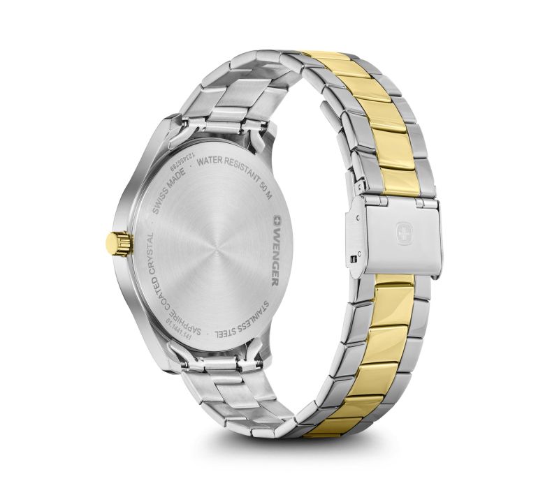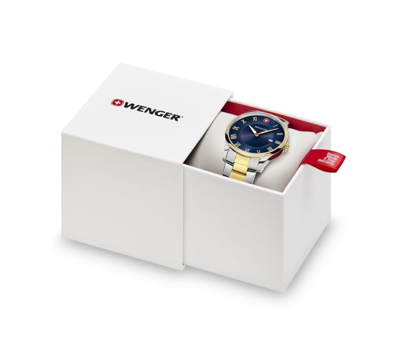 Стилен и елегантен мъжки часовник със син циферблат, верижка в комбинация от сребристо и златисто. Тънкия полиран сребрист копрус е очертан със златист ринг и има класически, изискан циферблат с римски индекси и прозорец с дата на 3 часа. Този модел на WENGER излъчва вечен стил, неподражаем на времето.