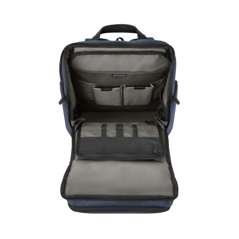 - Два вертикални джоба с цип отпред, в единия от които има характерния за Victorinox мулти-инструмент (отварачка за бутилки, отвертка, стриппер) от швейцарския армейския нож