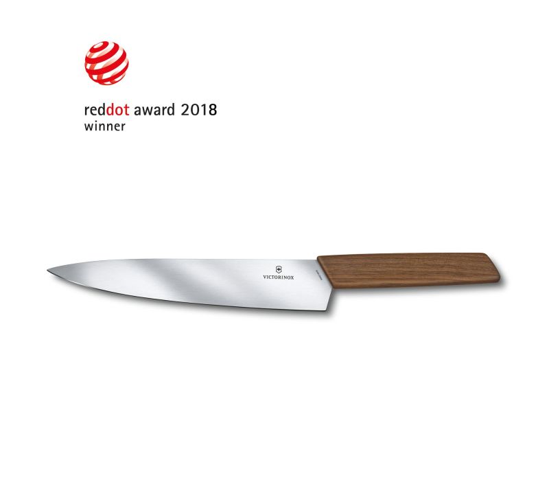 Ножът Swiss Modern Carving Knife реже чисто и безпроблемно всички видове храни, като прави лека работата както при нарязване на големи късове месо, така и на плодове и зеленчуци. Подобно на всички ножове в колекцията Swiss Modern, той има дръжка със специална ергономична форма, изработена орехово дърво. Топла и естествена, дръжката е напълно уникална и е с геометрична форма, за да придаде гладко и съвременно усещане. Елегантността, функционалността и високата производителност се съчетават в този красив, издръжлив и непреходен кухненски инструмент.