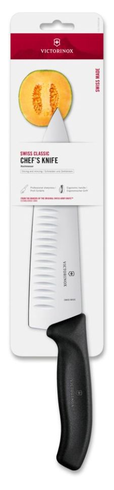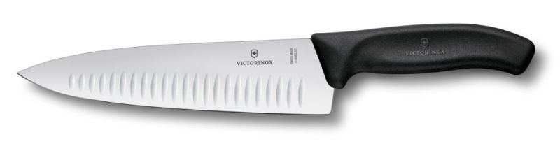 Този готварски нож е с професионално остро острие от неръждаема стомана с набразден ръб, което намалява залепването и триенето при рязане.